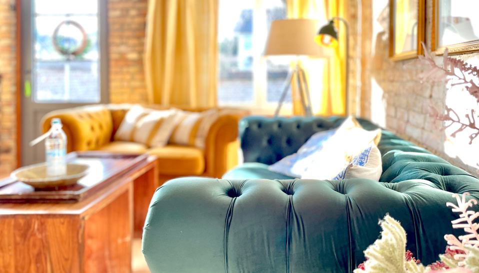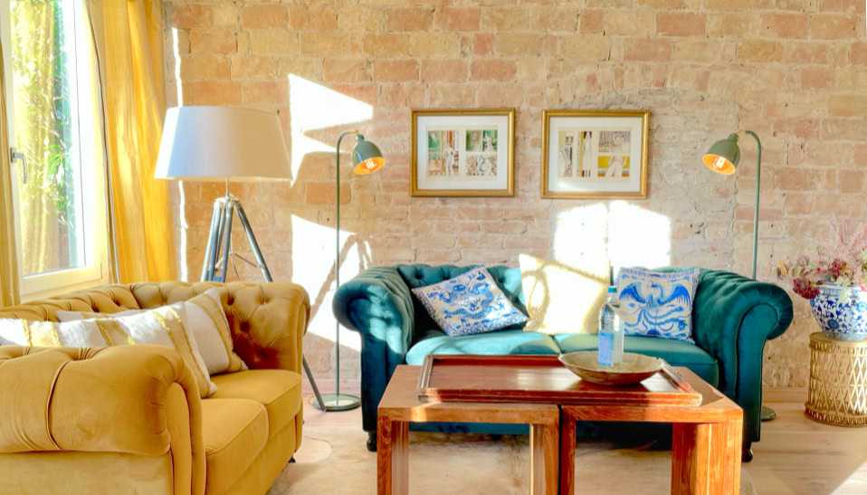 im Landhausstil; Backsteinwände und Holzdielen mit Gartenblick prägen die gemütliche Atmosphäre.