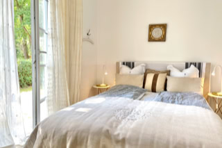 Schlafzimmer - mit Doppelbett (140x200cm) und bodentiefem Fenster. Eine zusätzliche Liegegelegenheit (Daybed) finden Sie im Wohnbereich.