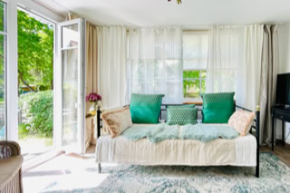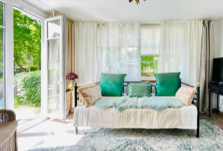 Wohnbereich - im charmanten Landhausstil eingerichtet. Mit einem gemütlichen Tagesbett-Sofa zum Schmökern oder als extra Schlafplatz und direktem Austritt zur Süd-Terrasse.