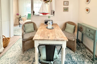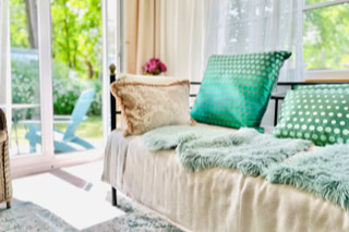 Wohnbereich - im charmanten Landhausstil eingerichtet. Mit einem gemütlichen Tagesbett-Sofa zum Schmökern oder als extra Schlafplatz und direktem Austritt zur Süd-Terrasse.