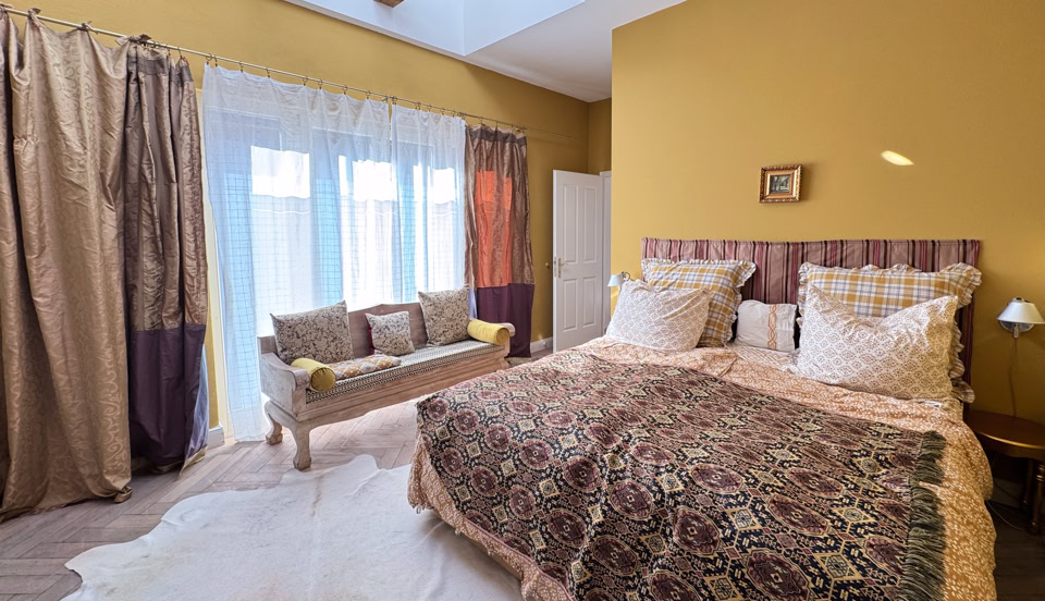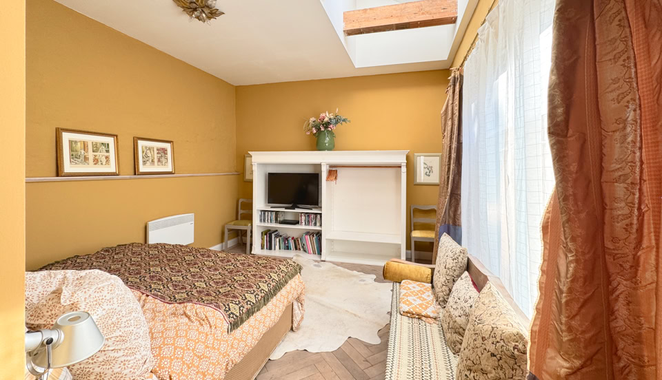 mit einem superior Boxspring-Bett 180 x 200cm. Parkett und Atelier-Dachfenster schaffen Flair.