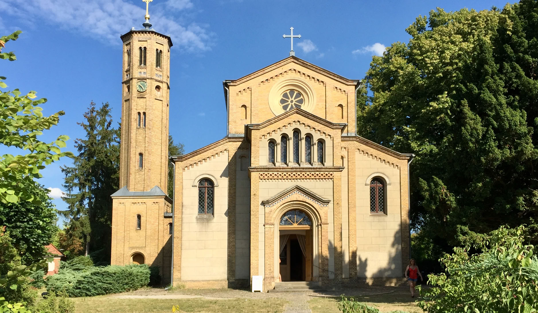 im romantisierenden norditalienischen Stil als Basilika mit freistehendem Campanile. Gebaut im Auftrag des preussischen Königs Friedrich Wilhelm IV. von Hofarchitekt Friedrich A. Stüler.